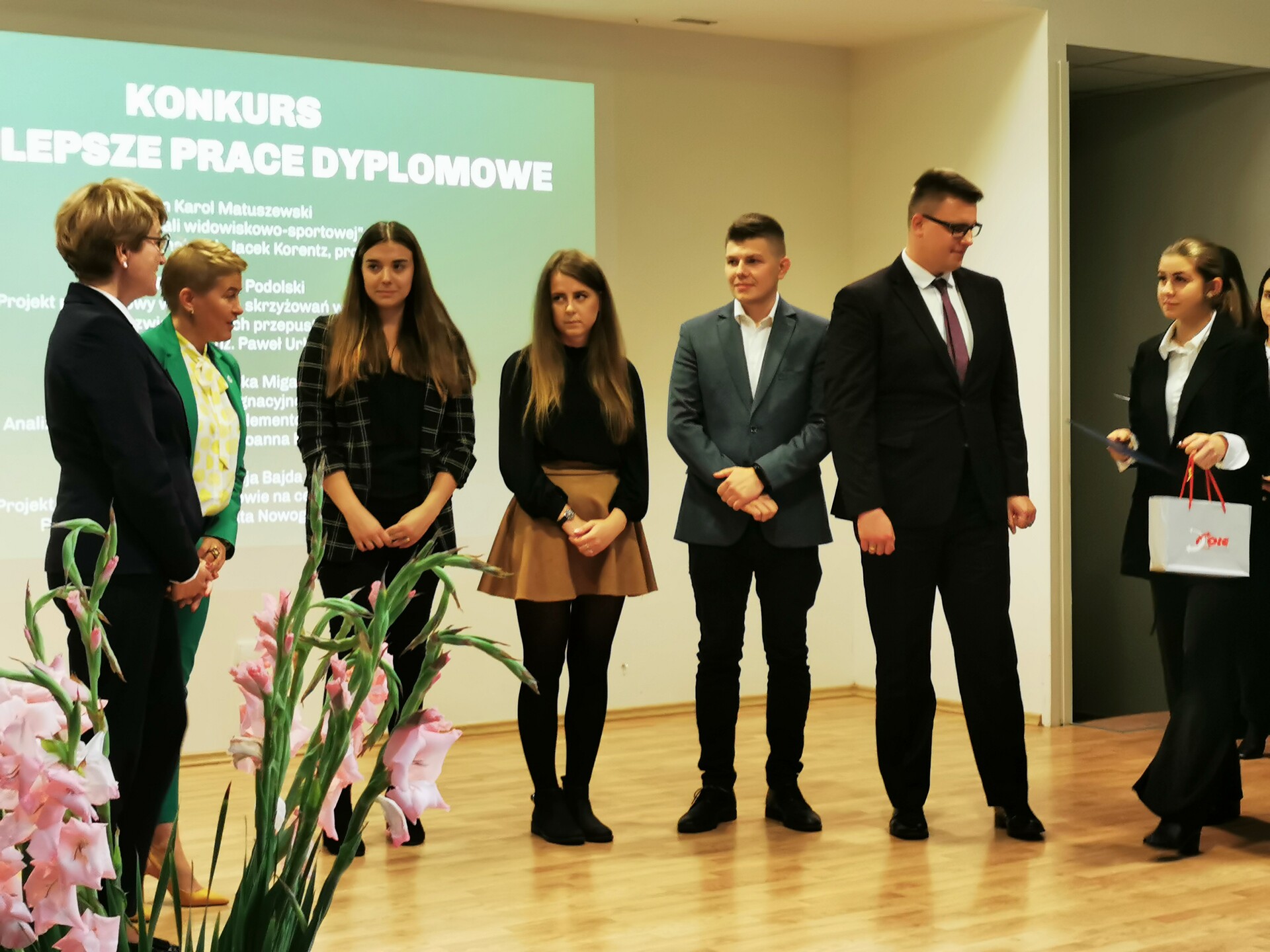 od lewej: Marszałek Województwa Lubuskiego Elżbieta Anna Polak, Prorektor ds. Współpracy z Gospodarką - prof. Maria Mrówczyńska, studenci: Patrycja Bajda, Agnieszka Migała, Karol Matuszewski, Jędrzej Podolski; fot. K. Urbańska