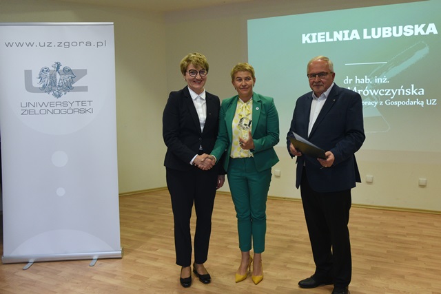 Marszałek Województwa Lubuskiego Elżbieta Anna Polak, dr hab. inż. Maria Mrówczyńska, prof. UZ – prorektor ds. współpracy z gospodarką UZ, Zenon Bambrowicz, prezes Lubuskiej Izby Budownictwa; fot. K Adamczewski